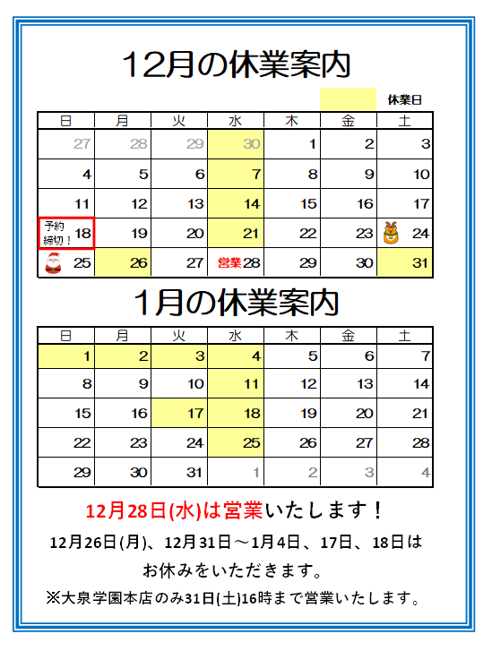 12月22日から1月7日の間、オンラインでのご配送の際お日にちのご指定はお受けできません。ご用意出来次第順次発送となりますのでご利用の際はご注意ください。